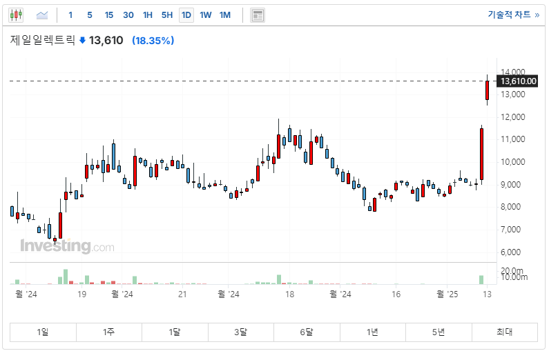 제일일렉트릭은 북미 최대 에너지 솔루션 기업 **이튼(Eaton)**과의 협력 관계를 통해 글로벌 시장에서 독보적인 위치를 차지하고 있습니다. 이 회사는 고압 차단기, 스마트 배선기구 등 전력망 핵심 부품 제조에서 강점을 가지고 있어, 복구 수요가 증가할수록 필수적인 파트너로 부각되고 있습니다. 이번 사건 이후 제일일렉트릭은 주가 상승과 함께 투자자들의 관심을 받으며, 하루에만 18.09% 상승하는 강세를 보였습니다. (10시 기준)