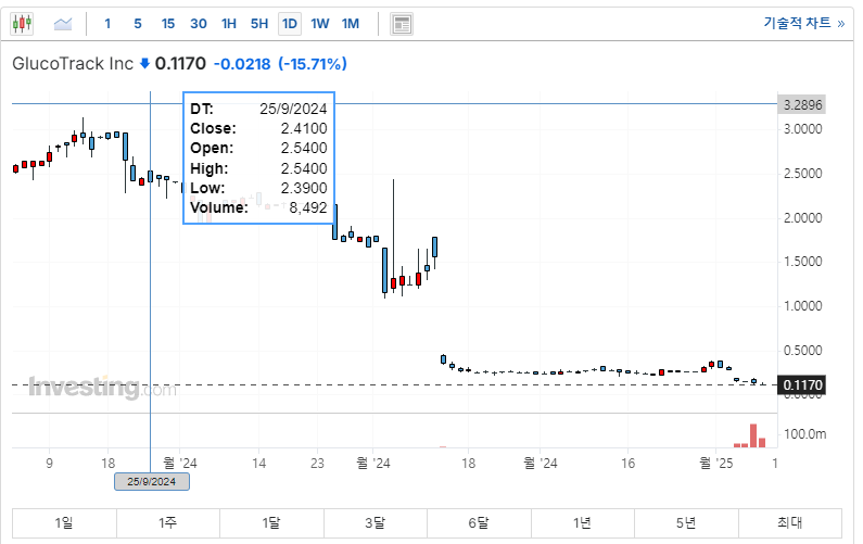 하지만 이러한 낮은 유동성은 양날의 검입니다. 상승 시에는 큰 폭의 주가 상승을 기대할 수 있지만, 하락세에서는 반대로 급락 위험이 큽니다. 특히, 글루코트랙과 같은 초기 기술 기업은 재무 안정성이 부족해 추가적인 주식 발행이나 자금 조달로 인해 기존 주주 지분 희석 위험이 상존합니다.