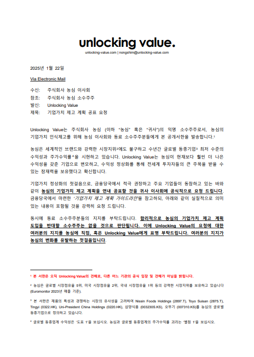 최근 농심의 한 소액주주가 ‘언로킹 밸류(Unlocking Value)’라는 이름으로 낮은 수익성과 주가수익률을 문제 삼으며 공개 주주서한을 발송했습니다. 국내에서 개인투자자가 공개 서한을 발표한 건 처음 있는 일이라 눈길을 끌고 있습니다. 농심 측도 이에 대해 글로벌 시장을 중심으로 성장 전략을 추진해 주주가치를 높이겠다는 입장을 밝혔습니다.
